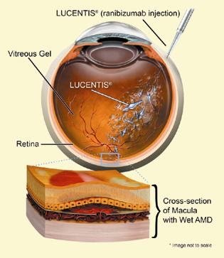 bo bajo anestesia tópica (gotas) y puede ser llevado a cabo en el consultorio. Antes del procedimiento, su oftalmólogo limpiará su ojo para prevenir infecciones y aplicará las gotas para anestesiar el ojo. Se utiliza una aguja de pequeño calibre, similar a la que se emplea para administrar insulina. La recuperación es rápida, usualmente a lo largo del día en el que se lleva a cabo la inyección. Los medicamentos más comunes que se administran intraocularmente son los medicamentos antiangiogénicos (impiden la formación de nuevos vasos), tales como el Avastin (bevacizumab) y Lucentis (ranibizumab). A nivel mundial, las inyecciones intravítreas de antiangiogénicos son la primera línea para el tratamiento de degeneración macular y también pueden ser utilizados en casos específicos de retinopatía diabética y oclusiones vasculares, entre otros. Este tipo de medicamentos actúa atacando un químico específico en el ojo que origina el crecimiento